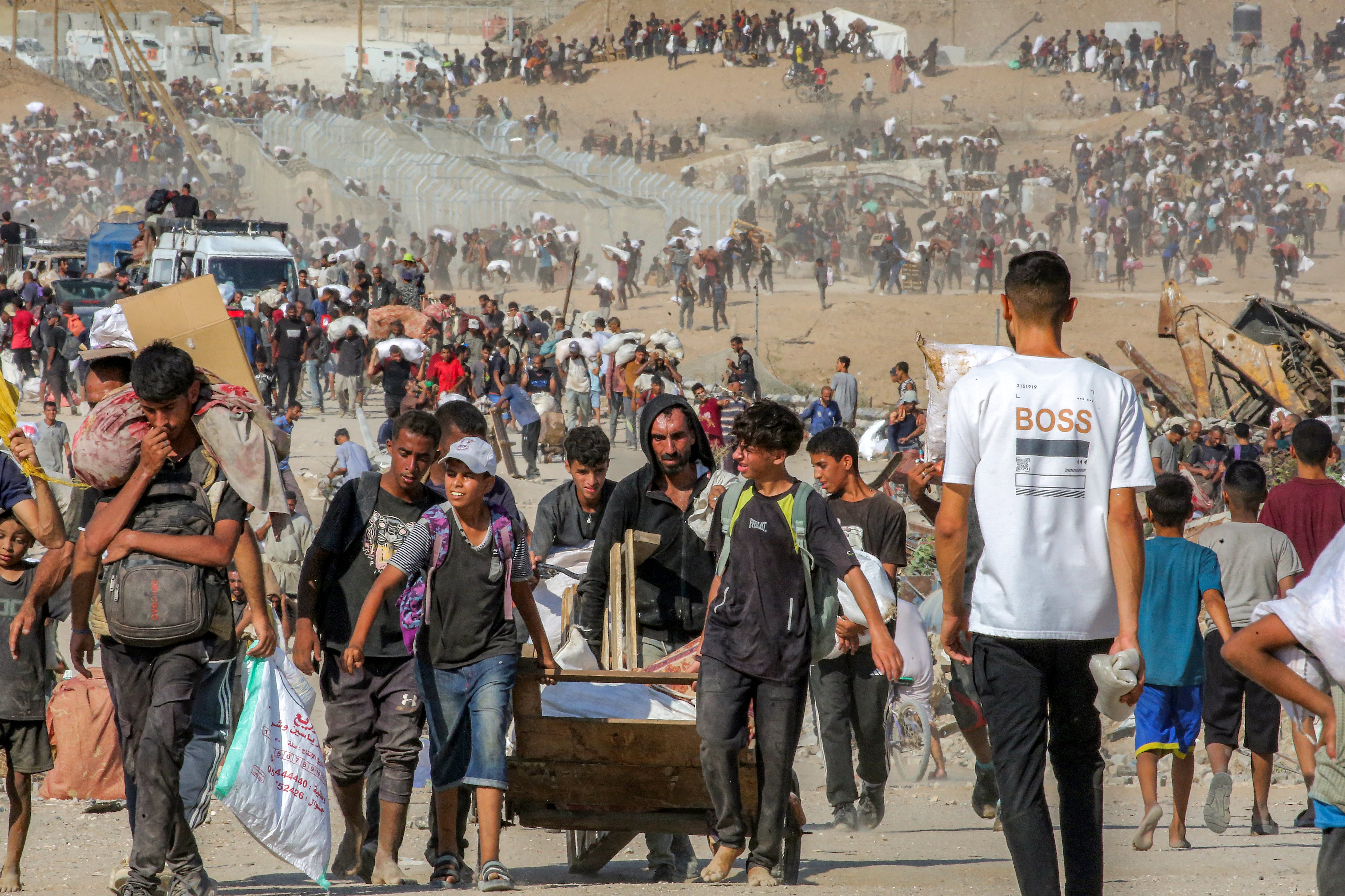 People walk with bags of humanitarian aid they received at a distribution centre run by the US and Israeli-backed Gaza Humanitarian Foundation (GHF), as they cross the so-called "Netzarim corridor" in the central Gaza Strip, on August 22, 2025. The United Nations officially declared a famine in Gaza on August 22, the first time it has done so in the Middle East, with experts warning 500,000 people face "catastrophic" hunger. UN agencies have long been warning of the deteriorating humanitarian situation in Gaza, particularly as Israel steps up its offensive against Hamas. (Photo by Eyad BABA / AFP) / EYAD BABA