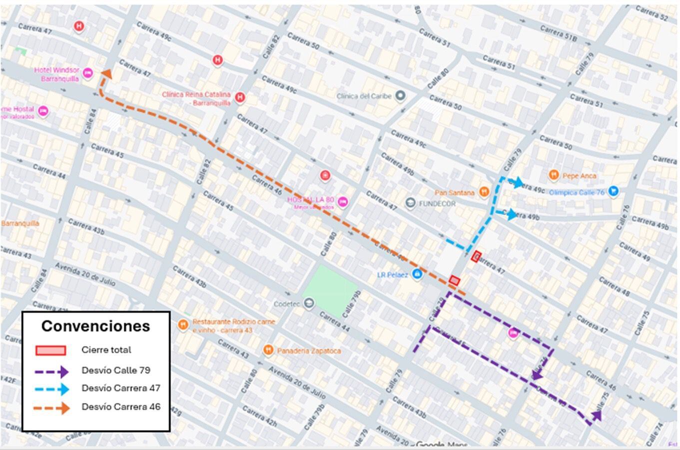 - Los usuarios que transitan por la carrera 47 deben girar a la izquierda en la calle 79, y tomar la carrera 49B o 49C para retomar su ruta.