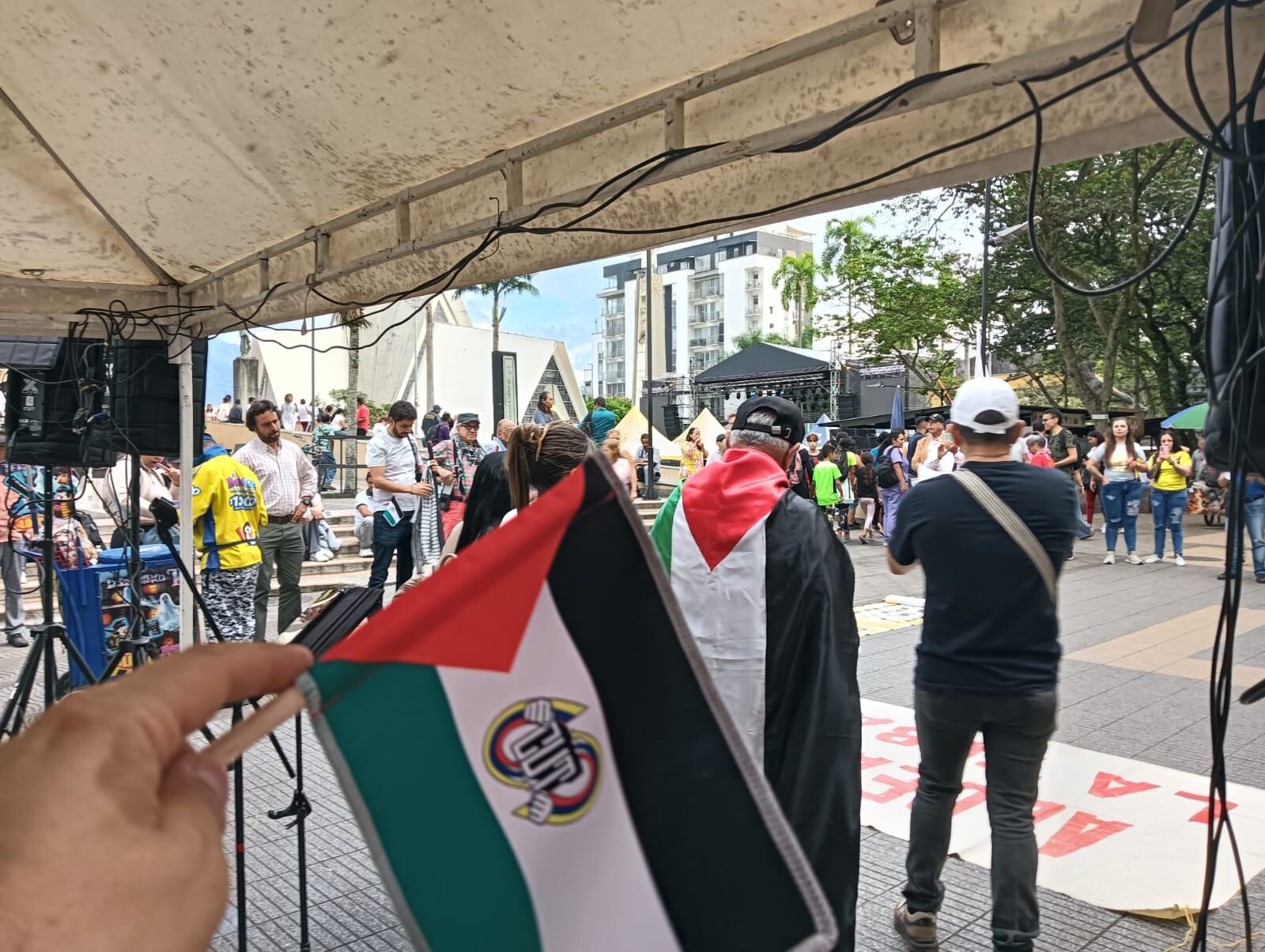 En la plaza de Bolívar Ibrahim Abdala un ciudadano palestino radicado en el municipio de Quimbaya con la bandera al hombro agradeció la solidaridad de Colombia frente a lo que está viviendo su pueblo y el rechazo al genocidio de hombres, mujeres, niños e inocentes en la franja de gaza.