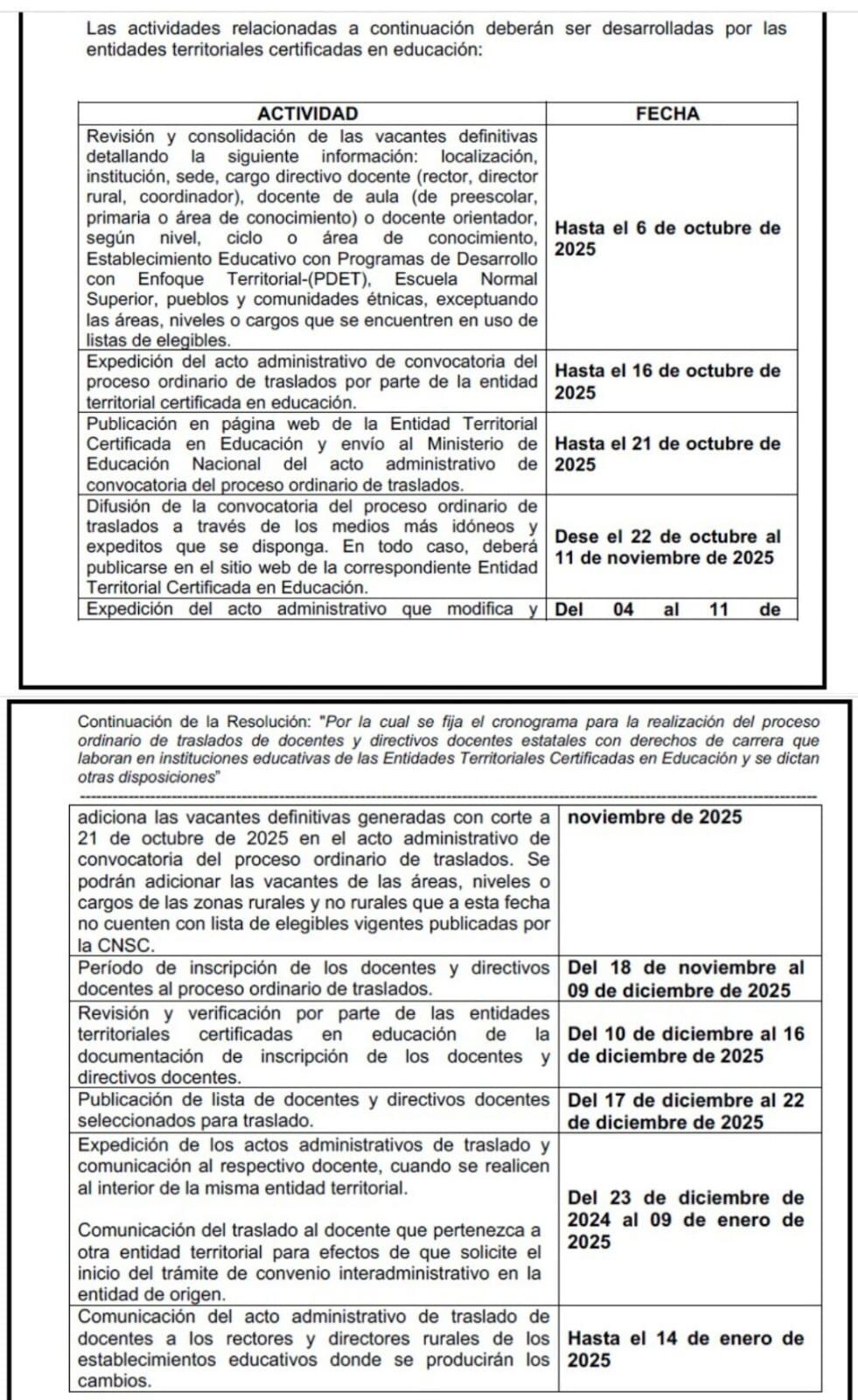 El Ministerio de Educación Nacional emitió una resolución en la cual se fija el cronograma para la realización del proceso ordinario de traslados de docentes y directivos docentes estatales con derechos de carrera que laboran en establecimientos educativos de las Entidades Territoriales Certificadas en Educación.