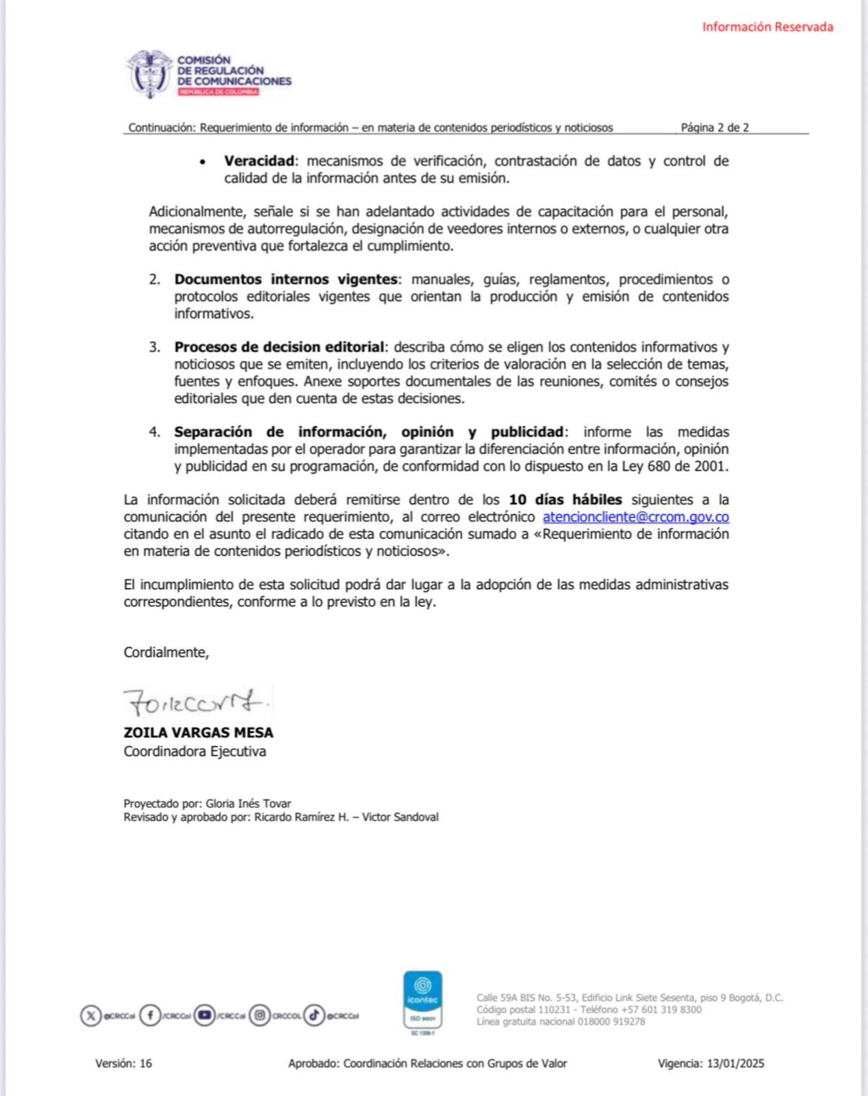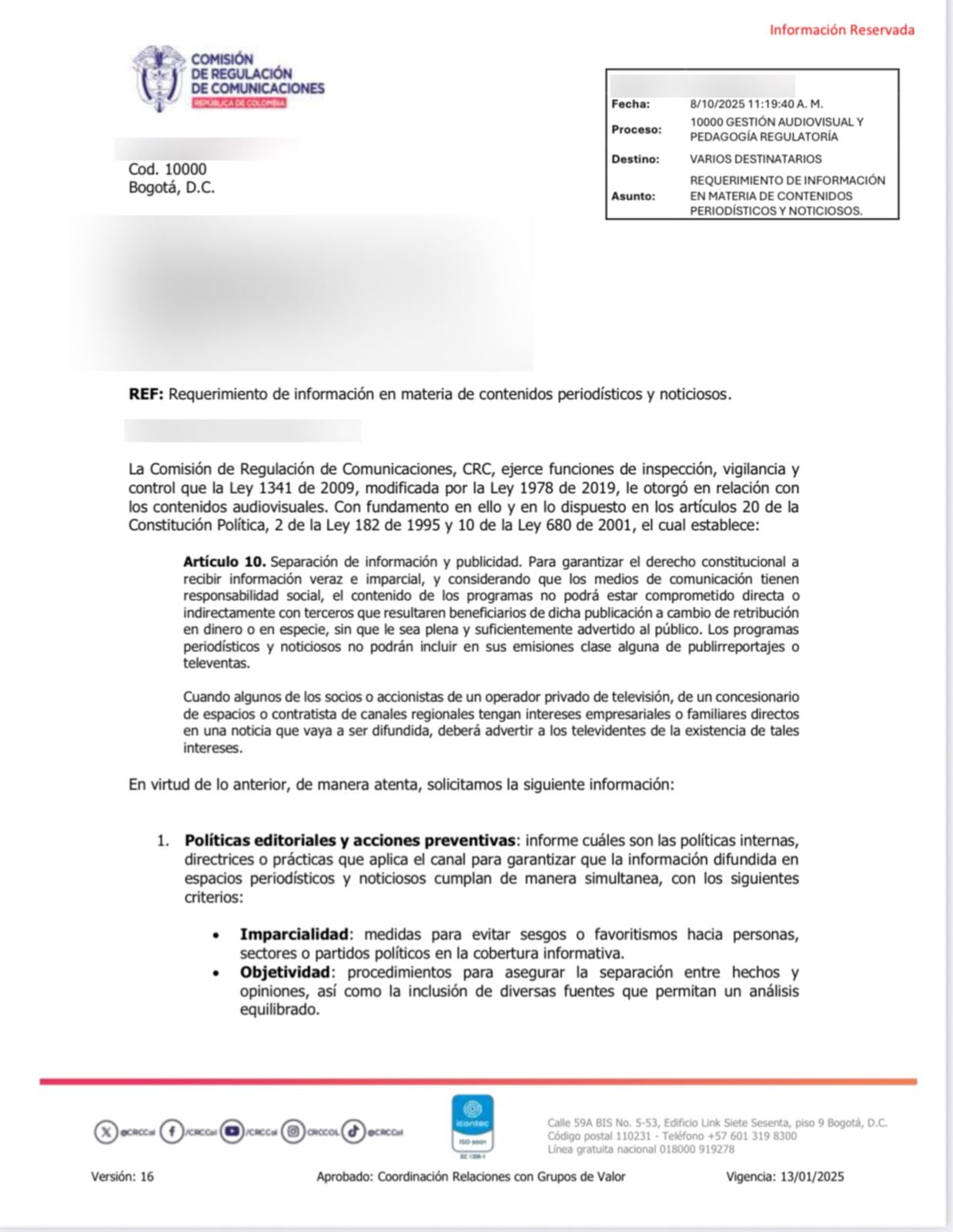 Entre ellas, solicita que entreguen la información correspondiente sobre los consejos editoriales. Ahora tendrán un plazo de 10 días hábiles para entregar dicha información.