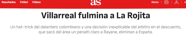 “Un hat-trick del delantero colombiano y una decisión inexplicable del árbitro en el descuento, que sacó del área un penalti claro a Rayane, eliminan a España”, mencionó el medio.