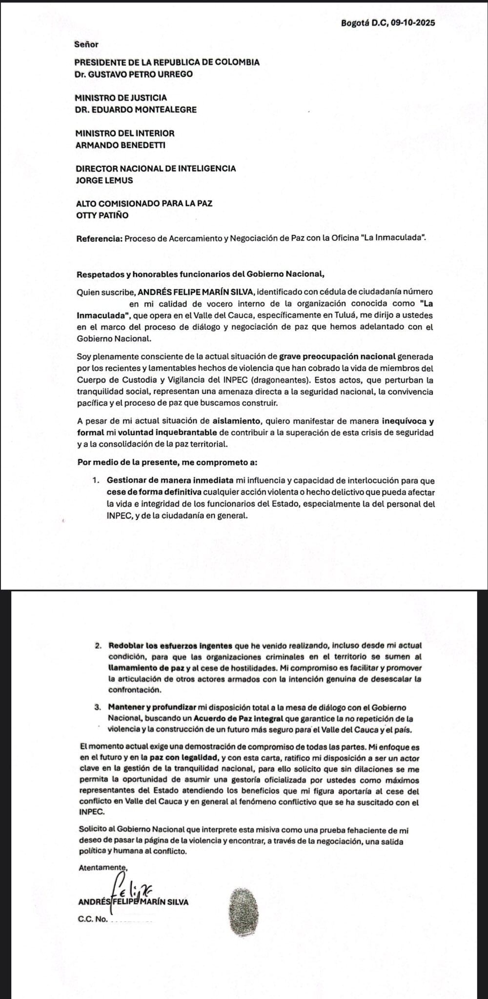 En la carta, alias ‘Pipe Tuluá’ se compromete a tres puntos para alcanzar un acuerdo de paz con el Gobierno Nacional y que cese la violencia contra funcionarios del Inpec.