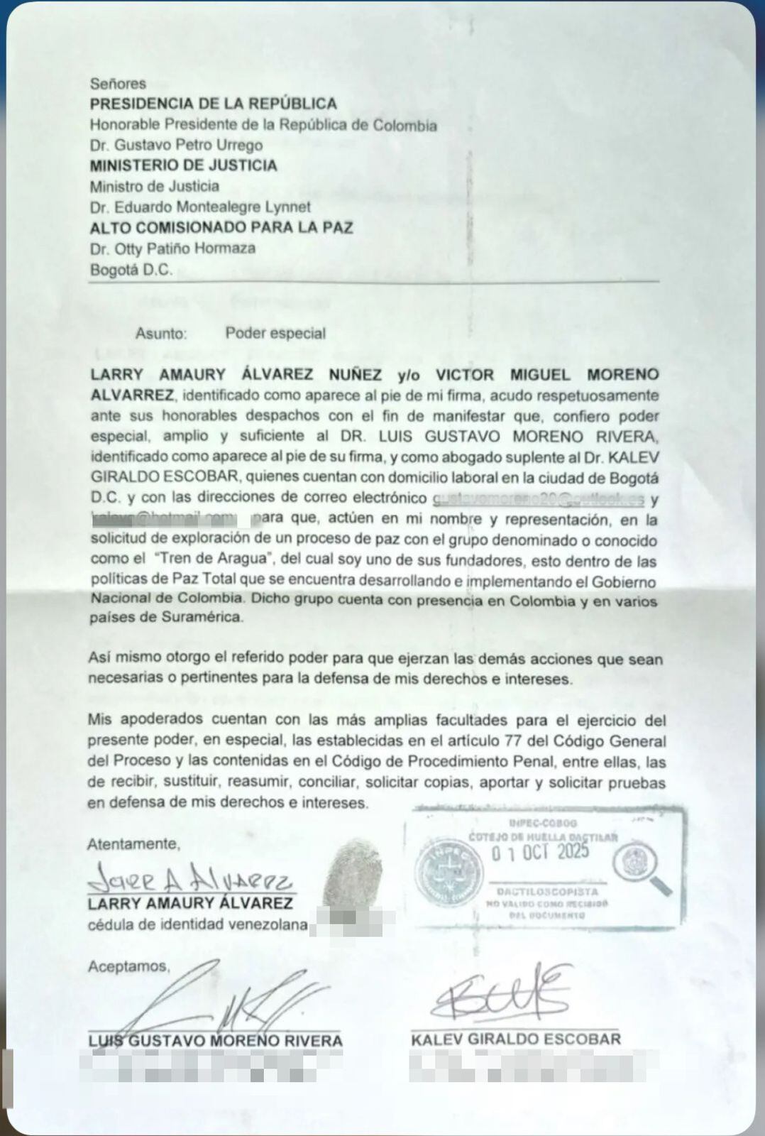 El pasado fin de semana, el ciudadano venezolano Larry Amaury Álvarez Nuñez, conocido con el alias de ‘Larry Changa’, uno de los cabecillas del Tren de Aragua preso en la cárcel La Picota de Bogotá, le envió una carta al presidente Gustavo Petro; al ministro de Justicia, Eduardo Montealegre, y al alto comisionado de Paz, Otty Patiño, acreditando al abogado Luis Gustavo Moreno para explorar “un proceso con el grupo denominado o conocido como ‘El Tren de Aragua’ del cual soy uno de sus fundadores, esto dentro de la política de paz total que se encuentra desarrollando e implementando el Gobierno Nacional de Colombia”.