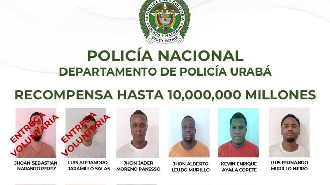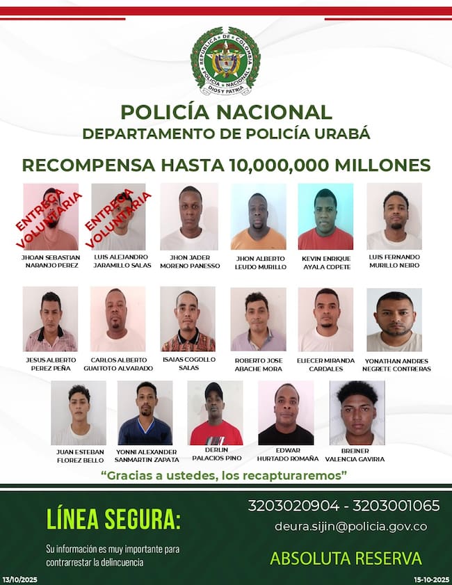 Se trata de Johan Sebastián Naranjo Pérez y Luis Alejandro Jaramillo Salas, quienes, según el reporte de la policía, se entregaron de manera voluntaria a las autoridades. También se informa que se elevó la recompensa de cinco a diez millones de pesos para quien entregue información que permita la recaptura de los 15 delincuentes restantes. Ante esta situación, le solicitan apoyo de la comunidad para ubicarlos lo más pronto posible. Recordemos que el mismo día de la fuga, en la reacción de las autoridades, fue recapturada casi de inmediato otra persona.