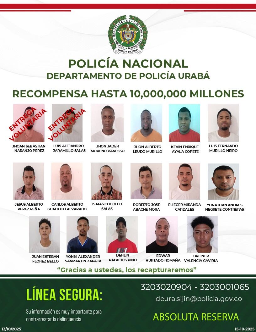 Se trata de Johan Sebastián Naranjo Pérez y Luis Alejandro Jaramillo Salas, quienes, según el reporte de la policía, se entregaron de manera voluntaria a las autoridades. También se informa que se elevó la recompensa de cinco a diez millones de pesos para quien entregue información que permita la recaptura de los 15 delincuentes restantes. Ante esta situación, le solicitan apoyo de la comunidad para ubicarlos lo más pronto posible. Recordemos que el mismo día de la fuga, en la reacción de las autoridades, fue recapturada casi de inmediato otra persona.