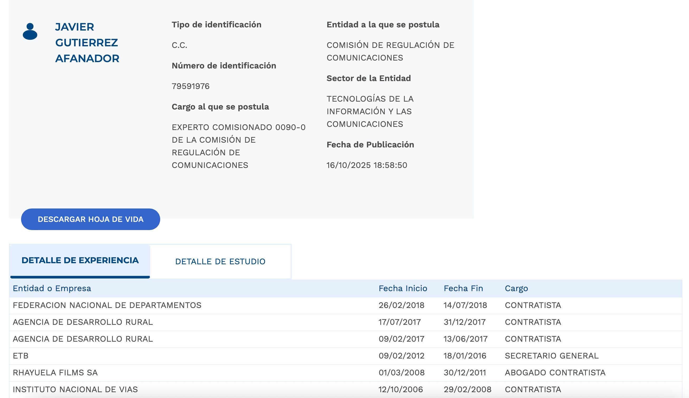 Uno de los requisitos cruciales es tener 8 años de experiencia específica relacionada con las funciones de la CRC, abarcando temáticas como interconexión, acceso, controversias y protección de usuarios. La CRC realizó una validación de los documentos aportados por Gutiérrez frente a esta normativa.