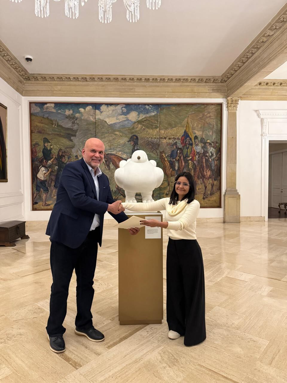 Se trata de una foto junto a la directora del Dapre, Angie Rodríguez y frente a la escultura de la paloma de la Paz que hay en Casa de Nariño, con la que oficializó su aceptación de la gestoría de paz.