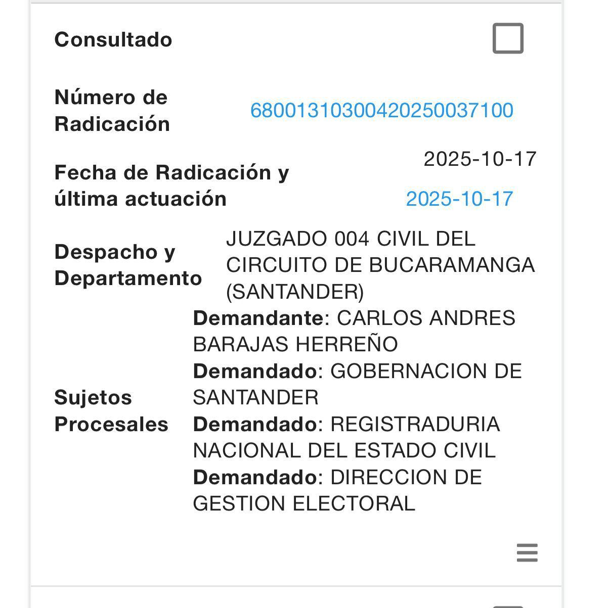 La tutela, que ya fue admitida por el Juzgado Cuarto Civil Municipal de Bucaramanga, busca que el juez ordene retroceder el calendario electoral y convoque nuevamente las elecciones, garantizando los plazos legales para todos los aspirantes.