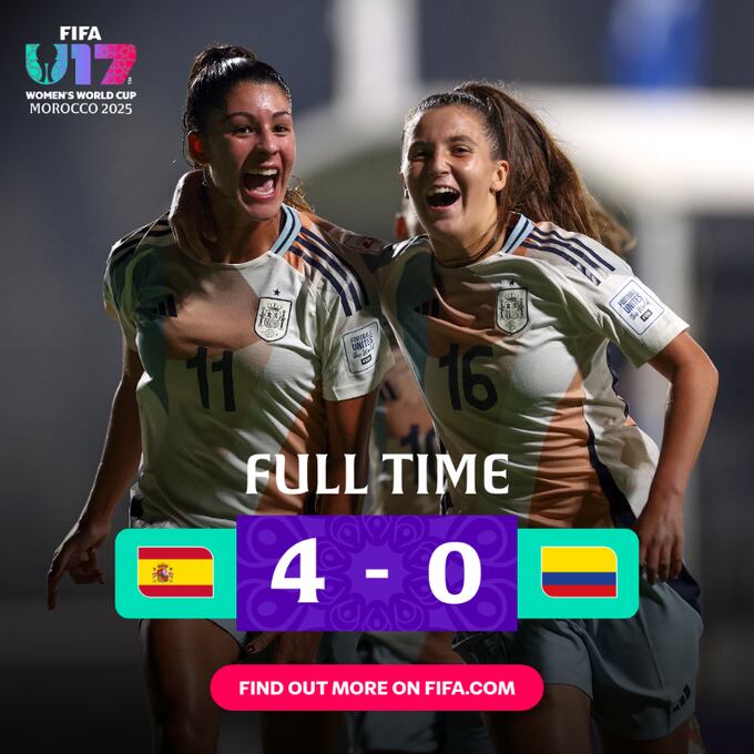 La Selección Colombia Femenina Sub-17 perdió por goleada ante 0-4 ante la Selección de España, este domingo 19 de octubre en lo que fue el debut de la Copa del Mundo de la categoría que se esta disputando en territorio marroquí, en el complejo deportivo Mohammed VI.