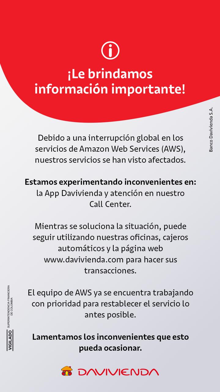 De acuerdo con el reporte de algunas entidades bancarias como Bancolombia, la operación de su aplicación y otros servicios no están disponibles, así como operaciones de transferencias y consultas de saldos.