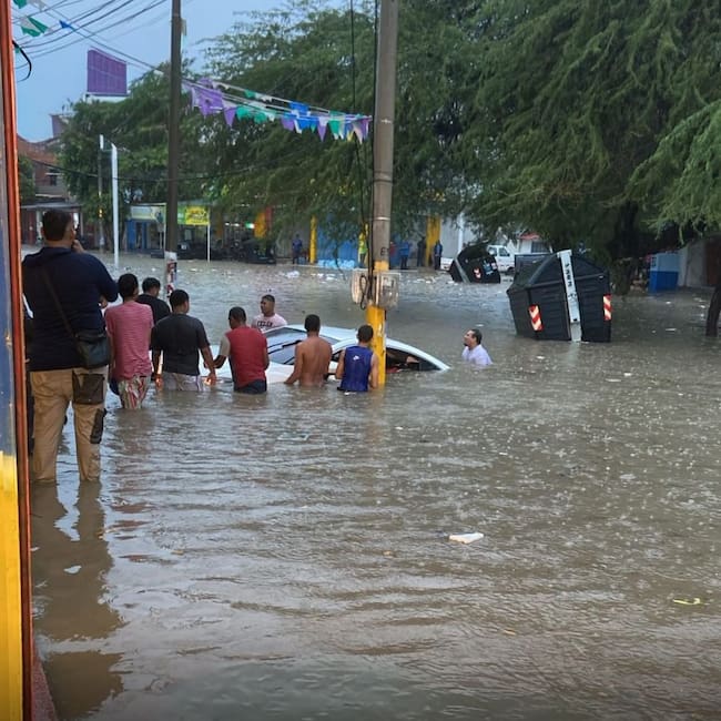 Un fuerte aguacero que ya completa más de tres horas tiene colapsadas varias calles del Centro Histórico de Santa Marta. Las intensas precipitaciones, originadas por el paso de una Onda Tropical, han provocado anegaciones en distintos sectores, dificultando la movilidad de las personas.