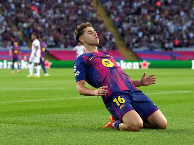 Fermín López celebra uno de sus goles ante el Olympiacos. (Photo by Alex Caparros/Getty Images) / Alex Caparros