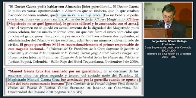 Y que incluso el Gobierno también tuvo unas fallas constitucionales y violaciones al derecho internacional gravísimas. Cada uno tuvo una responsabilidad, pero en el caso de Manuel Gaona Cruz, es indudable que el M-19 lo asesinó y lo asesinó en forma atroz.