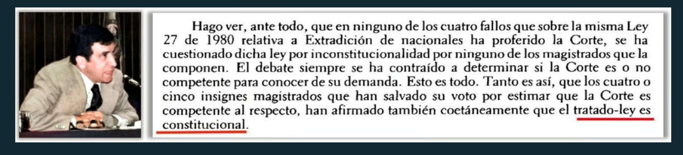 Sin embargo, no se le olvide que, dentro de las principales propuestas o demandas, y están ahí en el documento, las pueden ver, se le hace la trazabilidad completa a la relación entre narcotráfico y guerrilla. Se pueden dar cuenta de que una de las principales demandas es la extradición. En el momento en que Manuel Gaona Cruz estaba al uso de la palabra, en la Sala Constitucional, declarando una vez más que el tratado de extradición con los Estados Unidos, la ley aprobatoria, era totalmente constitucional. Entonces, se configuraron todos los elementos, más el nexo causal. Para no extenderme, simplemente invitaría a las personas que tienen curiosidad para saber cómo se configuró el crimen de lesa humanidad en este caso, acudir a la página web, porque ahí están los antecedentes y un análisis obviamente más, más complejo, que es un poquito más técnico.