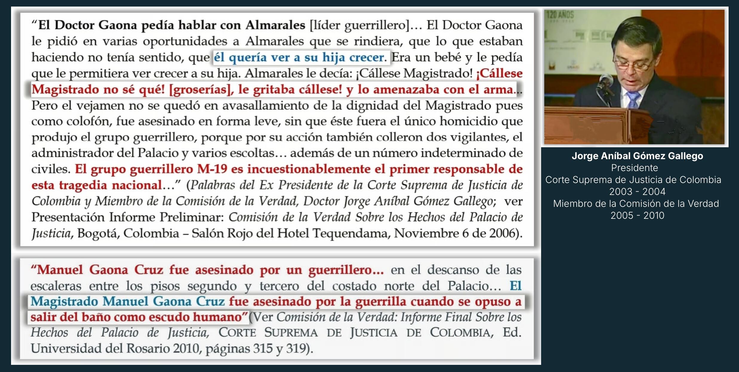 Si el memorial de agravios al Holocausto de la Justicia se escribiera cuarenta años después, tendría que titular “El turno es para la verdad”. Y creo que ya estuvo bien de manipular la historia, de utilizarla; estuvo bien de los sesgos, estuvo bien de reconstruir o tratar de reescribir o editar los crímenes contra la humanidad que allí se cometieron y las violaciones de derechos humanos. Nos pareció que, teniendo en cuenta la manipulación que se ha ejercido en torno al homicidio de Manuel Gaona Cruz, al asesinato de Manuel Gaona Cruz, tratándolo de sacar del Palacio de Justicia para regresarlo después (las diferentes teorías y rumores que han existido), pues era necesario hacer claridad, porque muchos de los testigos presenciales, de las personas que realmente saben lo que ocurrió, han fallecido, poco a poco, y se hizo un trabajo juicioso con ellos antes de que partieran, y con las pruebas.