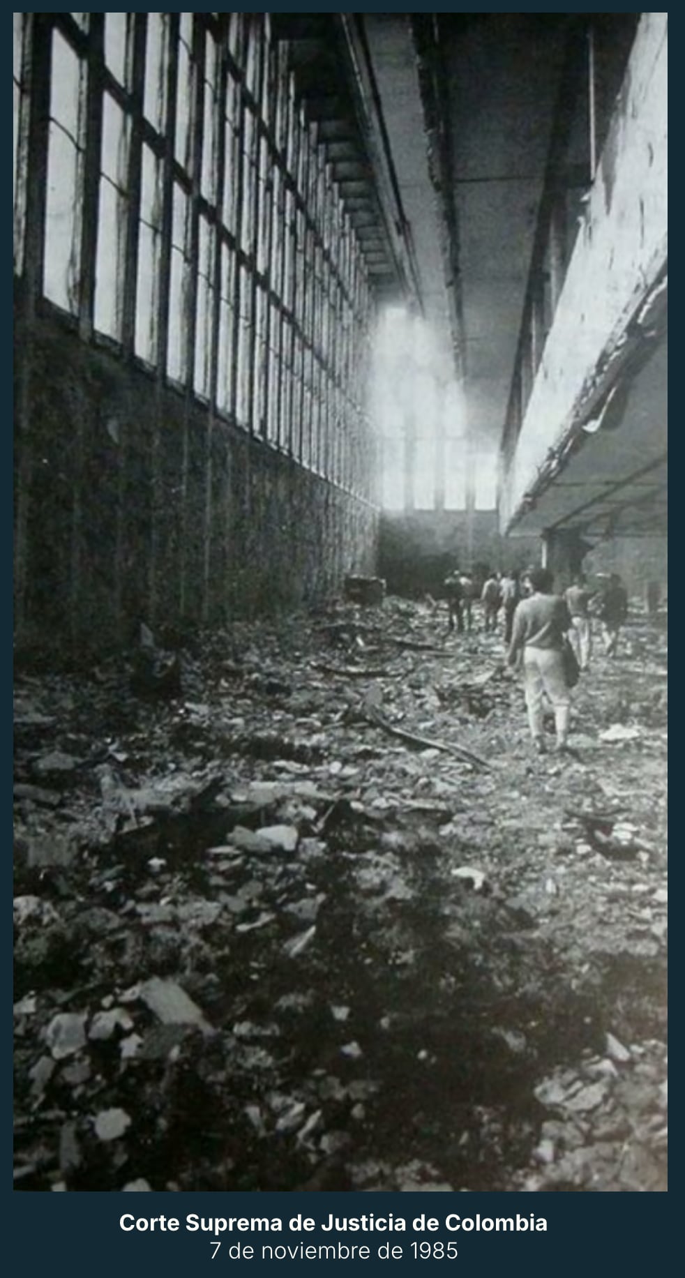 Pero si usted toma un tanque de guerra, independientemente de cuál es su explicación, y utiliza un tanque de guerra y le dispara a una Corte Suprema de Justicia donde hay cuatrocientos renes adentro, y quien está dirigiendo el mando operativo dice “yo no tengo conocimiento de rehenes”… Yo no sé quién está ahí o quién no está ahí, pero está disparando un tanque de guerra contra un muro donde puede haber civiles adentro. Esa es la comisión de un crimen contra la humanidad, en vivo y en directo. Que en Colombia haya habido formas de eludir esa responsabilidad tiene más que ver con falencias del sistema jurídico y procesal y constitucional colombiano, que con falencias del derecho internacional público.