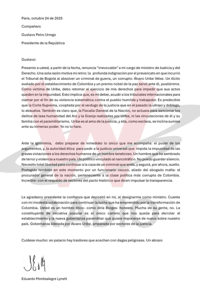 El ministro de Justicia cerró la carta lanzando fuertes dardos contra miembros del gabinete del presidente Petro diciéndole que hay “traidores” rodeándolo con “dagas peligrosas” y que siempre contará con su respaldo, especialmente en la Asamblea Constituyente.
