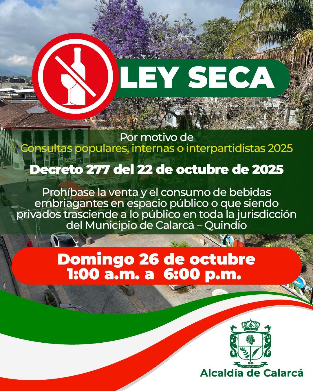 En cumplimiento del Decreto 277 del 22 de octubre de 2025, se establece Ley Seca en todo el municipio de Calarcá, Quindío, este domingo 26 de octubre