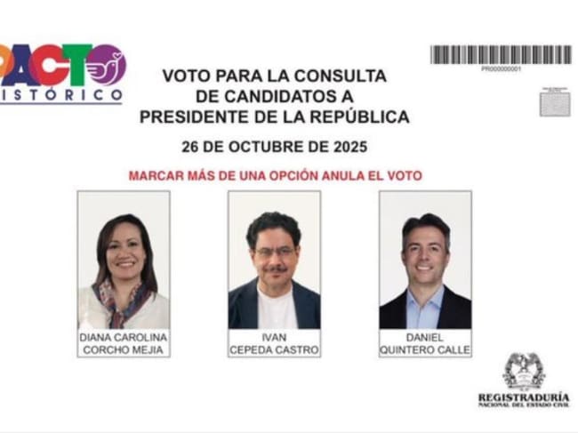 En principio, los tres nombres que figuraban dentro del tarjetón eran Iván Cepeda, Carolina Corcho y Daniel Quintero. Sin embargo, Aunque Daniel Quintero decidió retirarse oficialmente de la consulta del Pacto Histórico, su nombre y fotografía seguirán apareciendo en el tarjetón electoral.