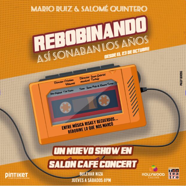 Prepárese para una breve temporada de noches mágicas, emotivas y, sobre todo, muy divertidas con “Rebobinando” la nueva propuesta de Café Concert, que aterriza en el Casino Hollywood de Bulevar Niza de jueves a sábado. Protagonizada por Salomé Quintero y Mario Ruíz, con la dirección musical de Juan Gabriel Turbay y la dirección artística de Christian Villamil, esta pieza promete desatar carcajadas, lágrimas y suspiros en el público con una puesta en escena vibrante y cargada de recuerdos que han marcado a generaciones enteras.
