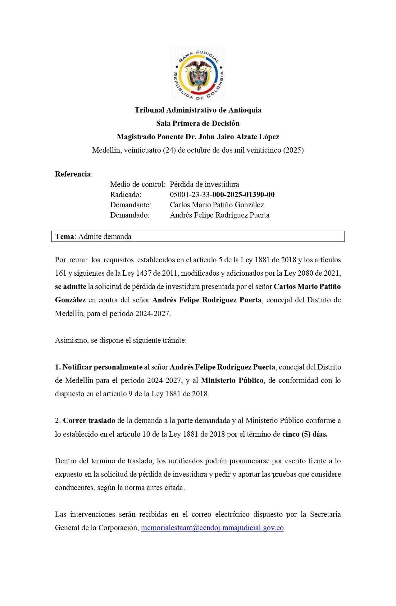 Este viernes se conoció que el Tribunal Administrativo de Antioquia, Sala Primera de Decisión, admitió la demanda que fue interpuesta contra el concejal de Medellín del Centro Democrático Andrés Rodríguez, conocido como “El Gury”, por presunto uso indebido de recursos públicos.