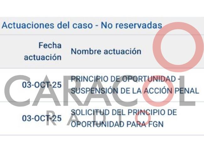 La solicitud quedó radicada el 3 de octubre de 2025 en uno de los procesos que se adelanta ante el Juzgado 27 Penal del Circuito con Función de Conocimiento de Medellín, y con ello se suspendió la acción penal en su contra, mientras la Fiscalía determina la viabilidad de la solicitud y posteriormente se presenta ante un juez para el respectivo control de legalidad del acuerdo propuesto.