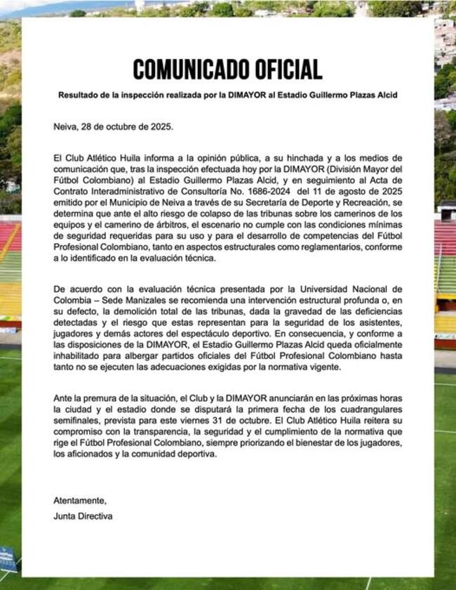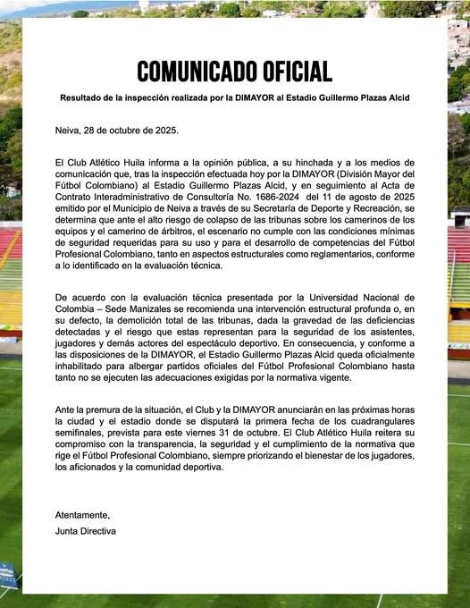 En rueda de prensa, directivas del Atlético Huila confirmaron que el equipo jugará los cuadrangulares finales en el estadio Manuel Murillo Toro de la ciudad de Ibagué; La decisión tiene asidero en el pronunciamiento de la Dimayor, tras la visita realizada por parte de una delegación de la entidad al estadio luego de conocerse la investigación de la universidad nacional de Manizales, donde daba cuenta de la debilidad estructural de las diferentes tribunas del estadio.