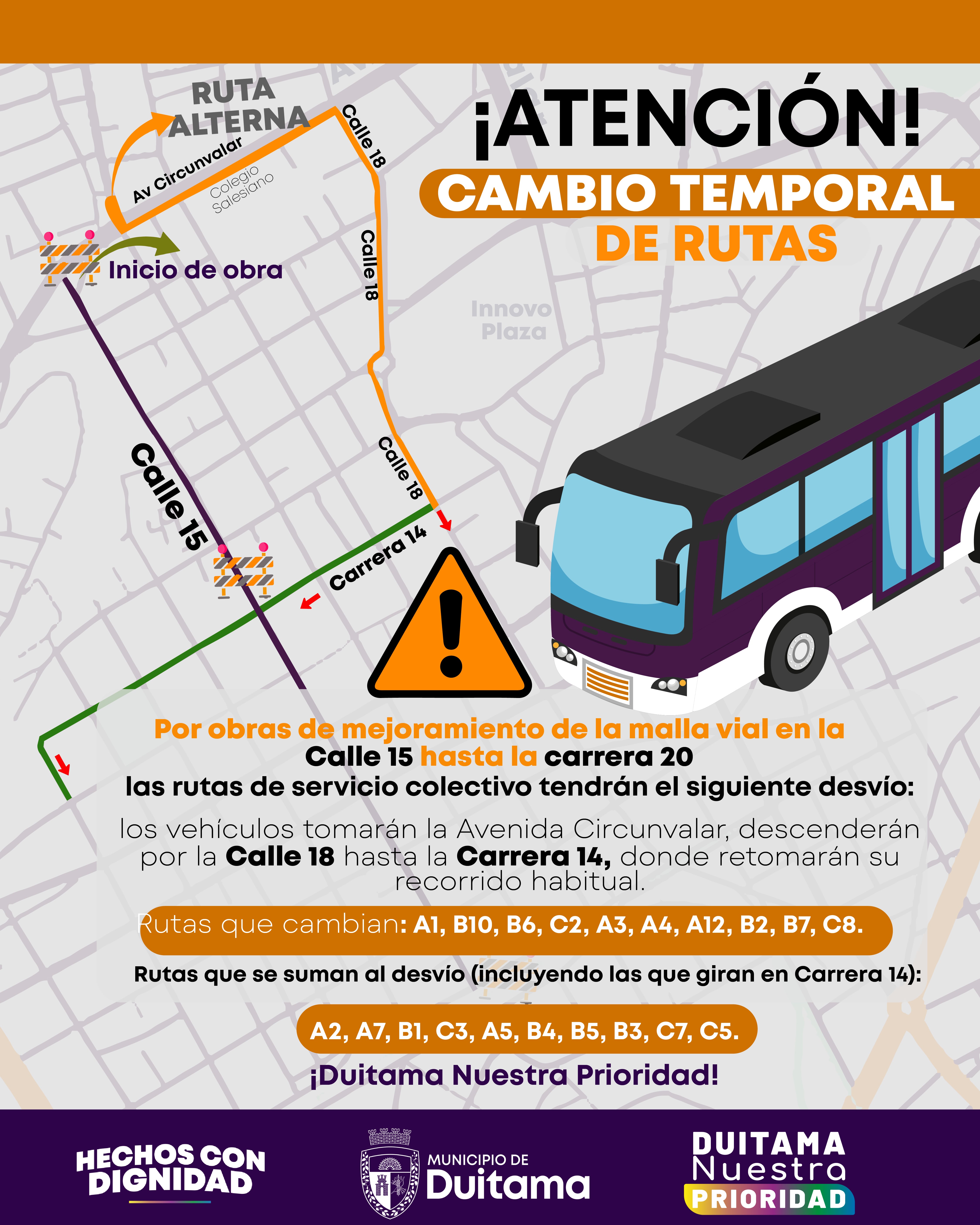 Para garantizar la movilidad, la Secretaría de Tránsito habilitó rutas alternas. Por ejemplo, las rutas que circulan por la Calle 15 con Avenida Circunvalar deberán desviarse por la Calle 18 con Avenida Circunvalar, retomando su recorrido en la Carrera 14. Otras rutas, como las que van hacia el Pueblito Boyacense, deberán girar por la Carrera 24 y la Calle 21 antes de retomar su trayecto habitual.