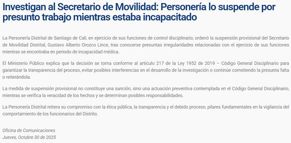 La Personería de Cali ordenó la suspensión provisional por tres meses del secretario de Movilidad, Gustavo Orozco, tras detectar presuntas irregularidades en el ejercicio de sus funciones mientras se encontraba en periodo de incapacidad médica.