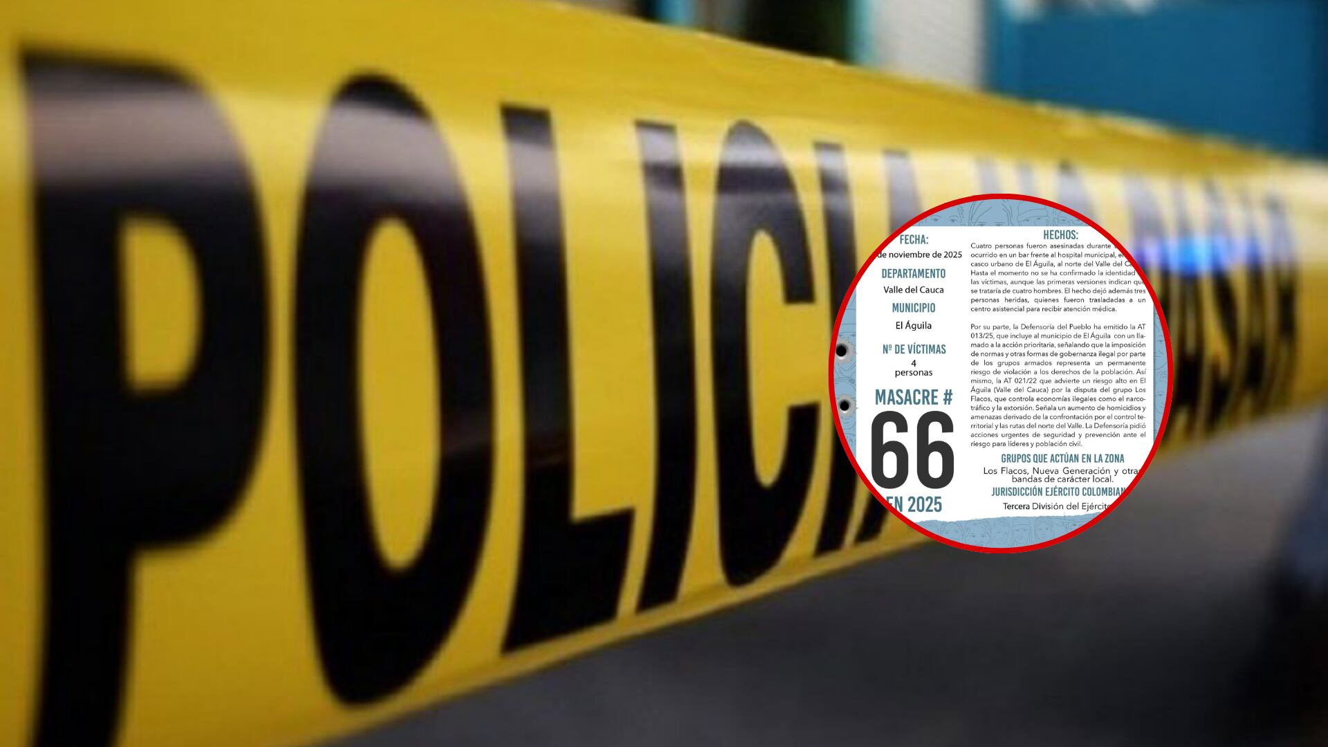 Este primero de noviembre, en el municipio de El Águila, norte del Valle del Cauca, se registró una masacre en la que murieron cuatro personas y tres más resultaron heridas.