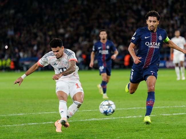 PARIS, FRANCE - NOVEMBER 04: Luis Diaz of Bayern Munich shoots whilst under pressure from Marquinhos of Paris Saint-Germain during the UEFA Champions League 2025/26 League Phase MD4 match between Paris Saint-Germain and FC Bayern München at Parc des Princes on November 04, 2025 in Paris, France. (Photo by F. Noever/FC Bayern via Getty Images) / F. Noever