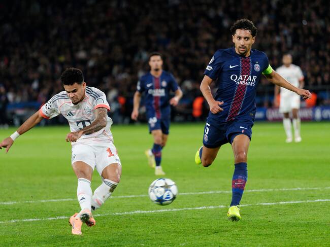 PARIS, FRANCE - NOVEMBER 04: Luis Diaz of Bayern Munich shoots whilst under pressure from Marquinhos of Paris Saint-Germain during the UEFA Champions League 2025/26 League Phase MD4 match between Paris Saint-Germain and FC Bayern München at Parc des Princes on November 04, 2025 in Paris, France. (Photo by F. Noever/FC Bayern via Getty Images) / F. Noever