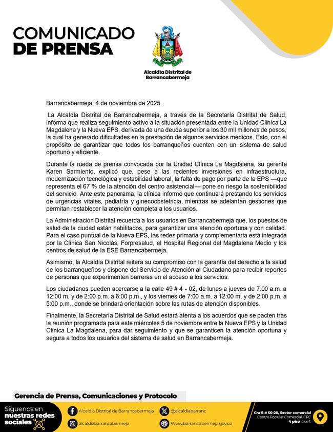 Ante el panorama, la Secretaría Distrital de Salud de Barrancabermeja anunció que se realiza seguimiento activo a la situación e informó que los usuarios de la Nueva EPS pueden acudir a la Clínica San Nicolás, Forpresalud, el Hospital Regional del Magdalena Medio y los centros de salud de la ESE Barrancabermeja, donde se garantizará la atención oportuna.