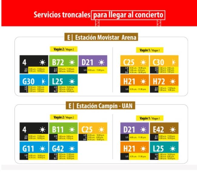 TransMilenio habilitó el servicio en las estaciones Movistar Arena y Campín – UAN con rutas que tienen como destino hacia los portales de la 80, Sur, Usme, 20 de Julio, Suba, Eldorado, Norte y Américas. Los despachos de estos servicios se ajustarán según la demanda de usuarios. El servicio de alimentación no tendrá ampliación de horario.