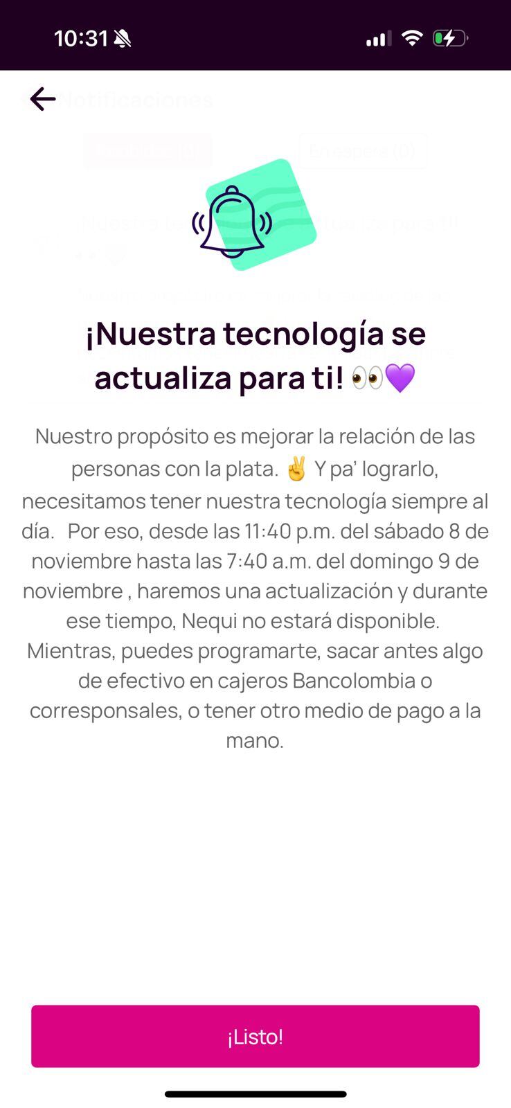 Sin embargo, Nequi, notificó que realizará una nueva suspensión con el fin de ejecutar una actualización . En este orden de ideas la aplicación no estará disponible durante determinado tiempo.