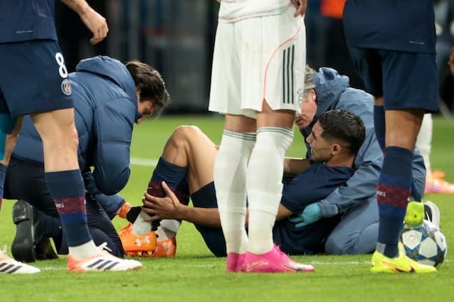 Achraf Hakimi tras la lesión que le ocasionó Luis Díaz. (Photo by Jean Catuffe/Getty Images) / Jean Catuffe