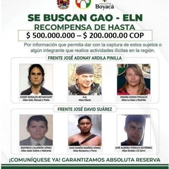 Se ofrecen $500 millones de pesos por información que permita capturar a Jussef Morales, alias “Saúl o Poeta”, cabecilla del frente José Adonay Padilla. Asimismo, hay $200 millones de recompensa por “Eliecer” y “La Gata”, así como por otros tres integrantes del frente José David Suárez.
