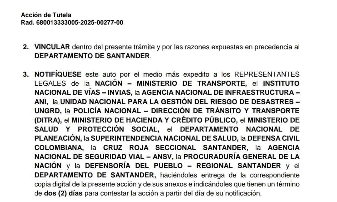 La demanda exige a entidades como Invías, la ANI y el Ministerio de Transporte que informen en un plazo de dos días qué acciones han tomado frente a esta emergencia vial.