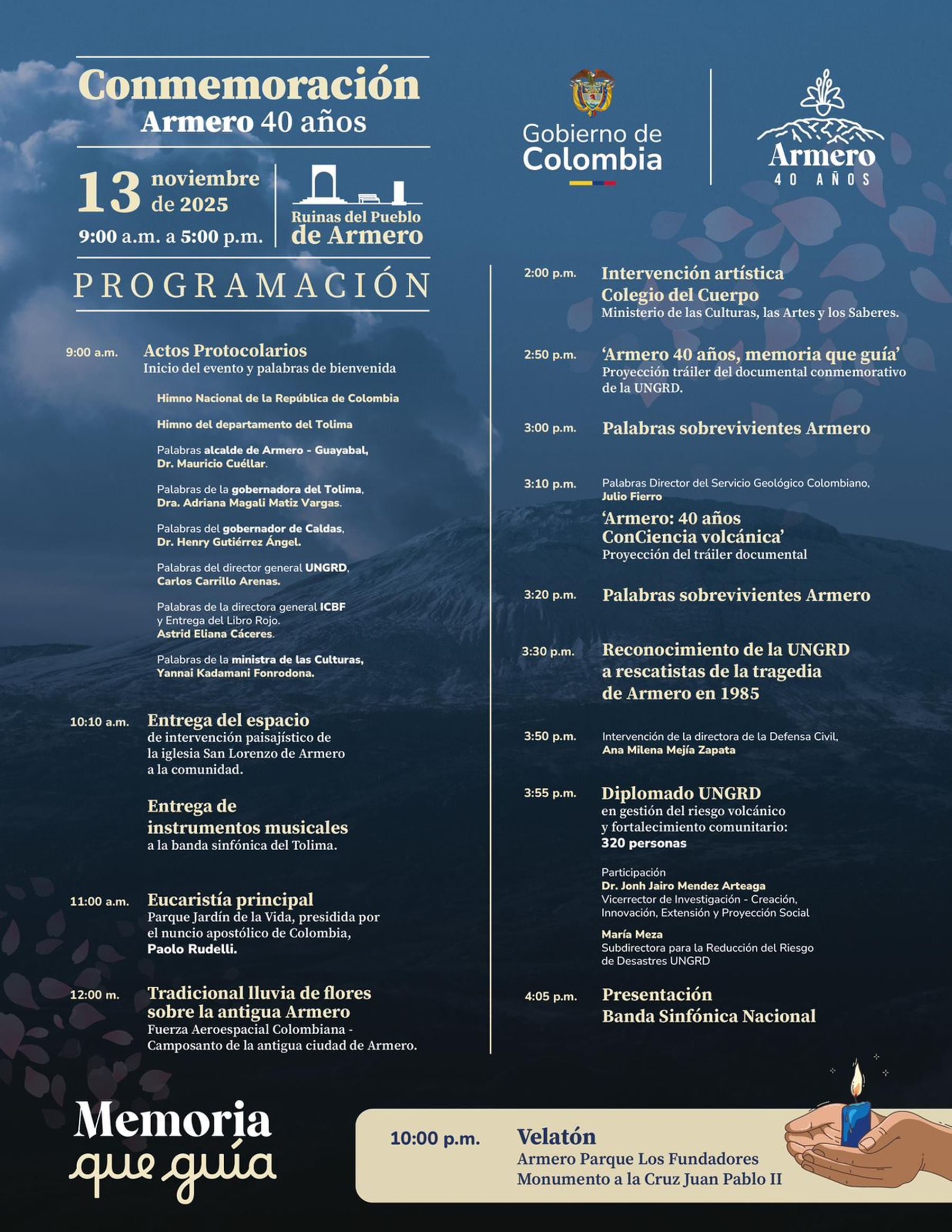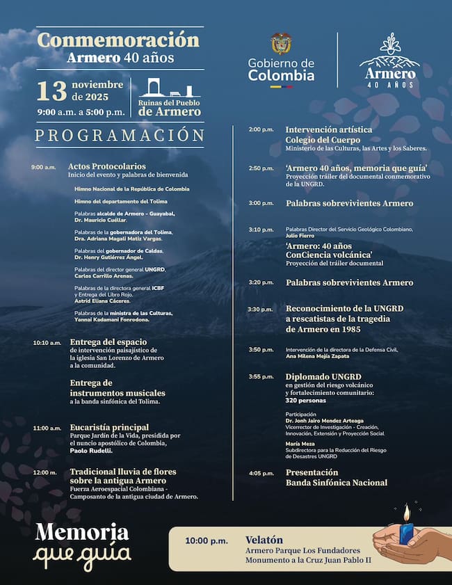 Por otro lado, el homenaje del próximo jueves 13 de noviembre en el municipio de Armero incluirá además actos simbólicos, ceremonias religiosas, recorridos de memoria y actividades culturales que buscan mantener viva la historia de Armero.
