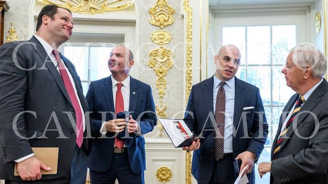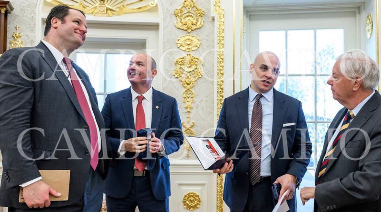 Lidsay Graham y Mike Lee, conversando con dos miembros del staff del presidente de Estados Unidos, ellos son James Braid, el enlace con el congreso, y James Blair, subjefe de gabinete.