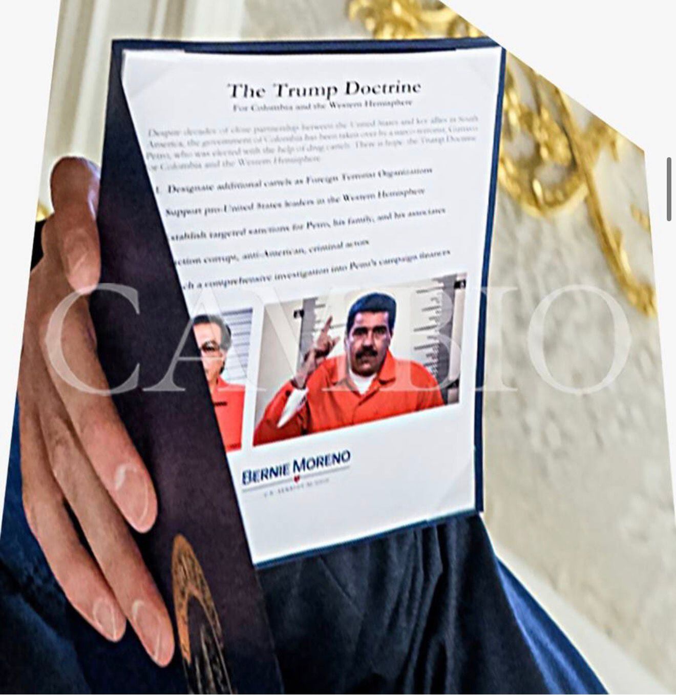 La hoja está titulada en inglés ‘La Doctrina Trump’ y tiene como subtítulo ‘Para Colombia y el hemisferio occidental’.