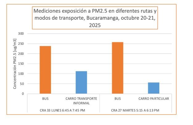 “Las concentraciones de PM2.5 fueron más del doble para pasajeros de bus público comparado con pasajeros de vehículo de transporte informal por la carrera 33 y más de 4 veces comparado con pasajeros de vehículo particular por la carrera 27″, se lee en el informe.
