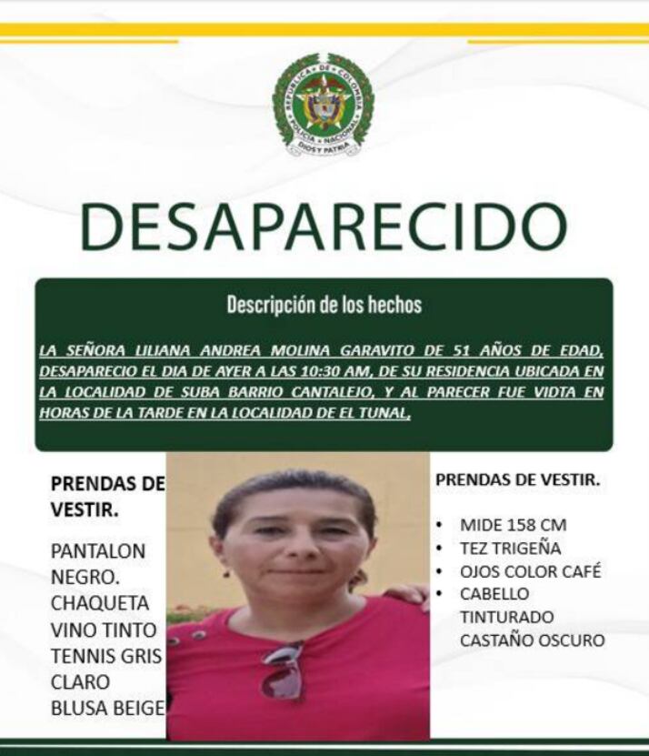 Una mujer identificada como Liliana Andrea Molina Garavito, de 51 años, fue encontrada sin vida el pasado 11 de noviembre en un hotel del centro de Tunja (Boyacá), un día después de haber sido reportada como desaparecida en Bogotá. La víctima, reconocida fonoaudióloga y trabajadora de los hospitales de Suba y Engativá, había salido de su vivienda en la localidad de Suba el 10 de noviembre en horas de la mañana, sin dejar rastro. Su familia denunció la desaparición y las autoridades iniciaron de inmediato la búsqueda en distintos sectores de la capital.