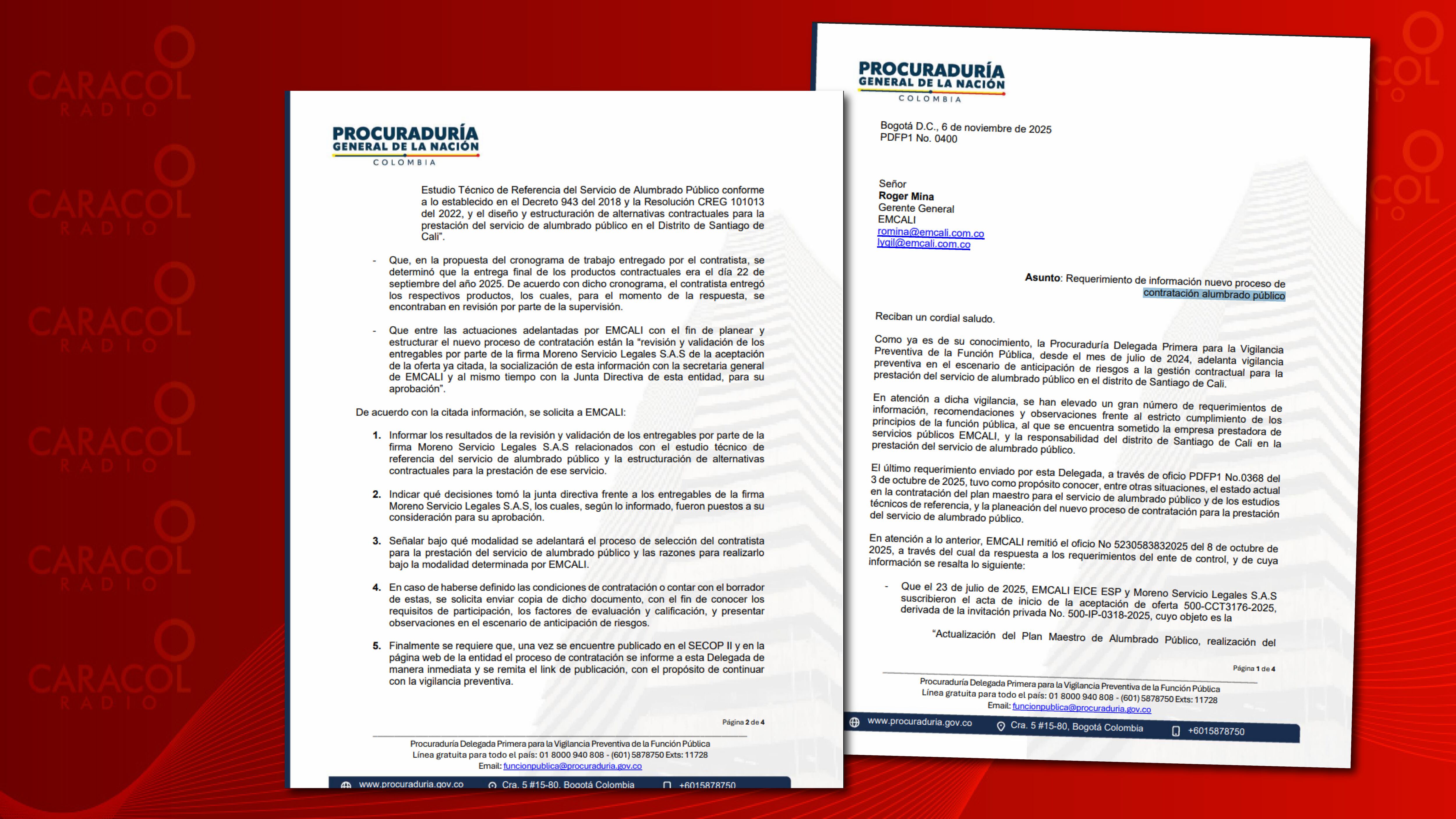 La Procuraduría tiene la lupa puesta en EMCALI por supuestas irregularidades el proceso de contratación para la renovación del alumbrado público de esa ciudad. Caracol Radio conoció el nuevo requerimiento del ministerio público, la respuesta que entregó la entidad cuestionada y se sabe que esta tarde se adelanta una visita para recolectar más información.