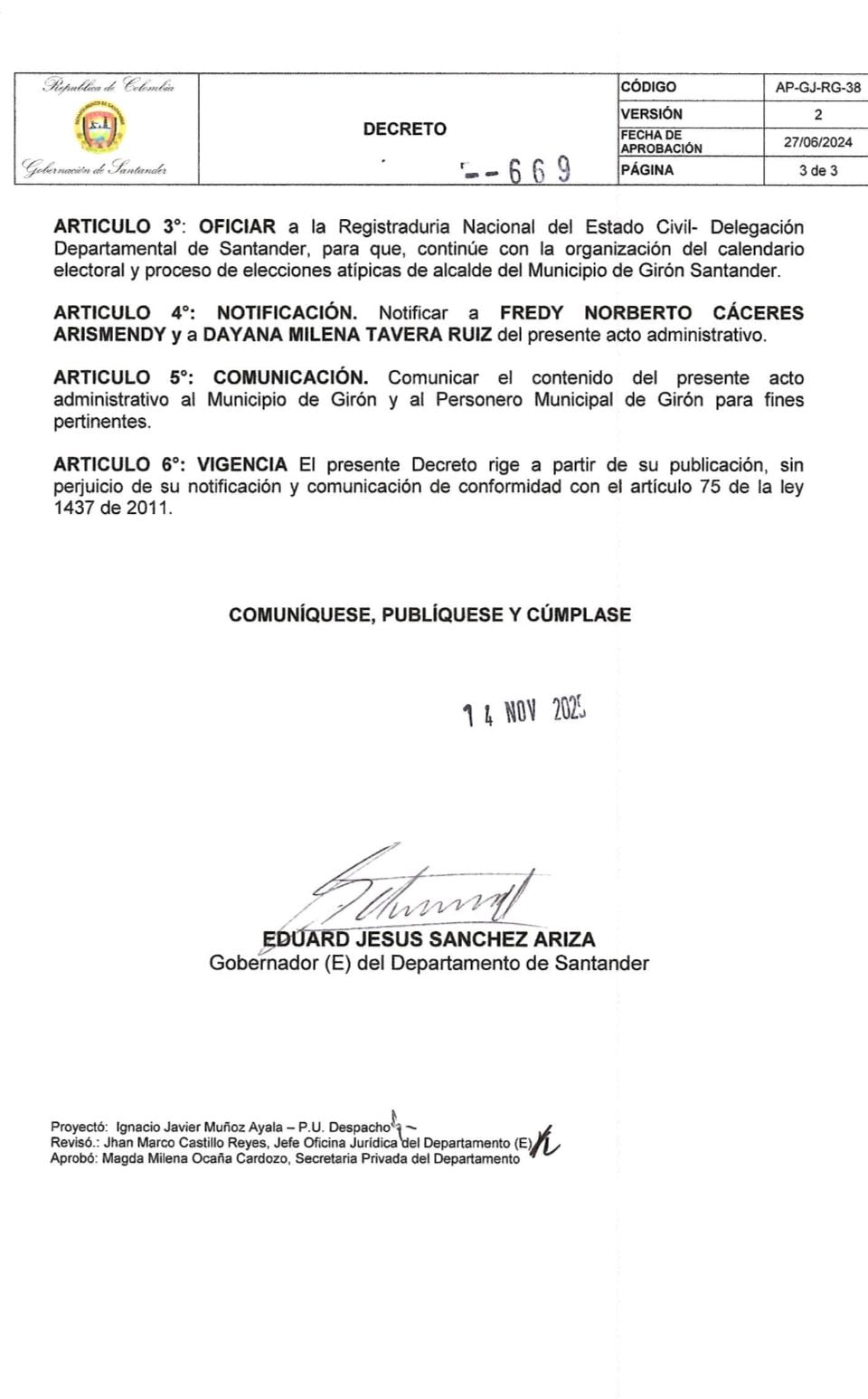 Las elecciones atípicas en Girón serán el 18 de enero de 2026.