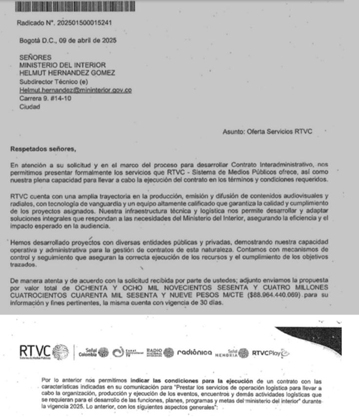 Ni Leyva, ni Benedetti quieren explicar cómo fue el cambalache, pero hay un detalle que llama poderosamente la atención: El Ministerio del Interior, dirigido por Armando Benedetti, recibió una carta de RTVC, el sistema de medios públicos, que dice responder a la solicitud del ministerio para adelantar un convenio interadministrativo por algo más de 88.000 millones de pesos para producir y emitir contenidos audiovisuales.