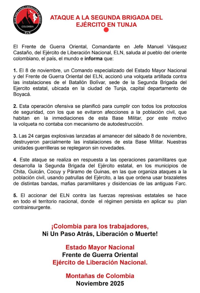 Un comunicado atribuido al ELN aseguró que un comando detonó 24 cargas explosivas contra la sede de la Primera Brigada del Ejército en Tunja, durante la madrugada del 8 de noviembre. El grupo afirmó que la acción buscaba evitar daños a civiles.