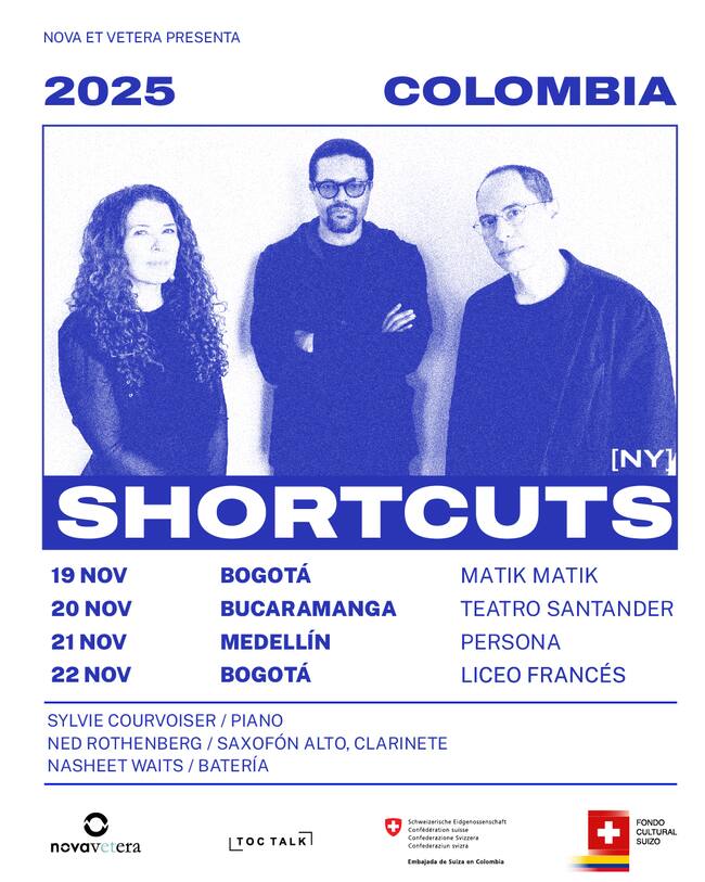 La gira, organizada por Nova Et Vetera con el apoyo de la Embajada Suiza a través del Fondo Cultural Suizo, acerca al público colombiano a una de las propuestas más inquietas y poderosas del jazz actual. SHORTCUTS es una invitación a sumergirse en la emoción de la improvisación y a descubrir cómo tres músicos excepcionales transforman el escenario en un espacio de creación sin fronteras.