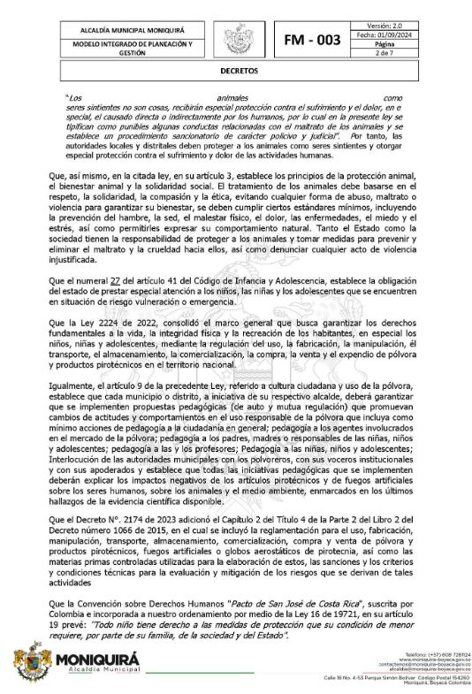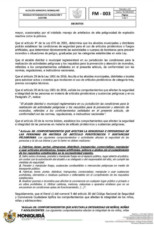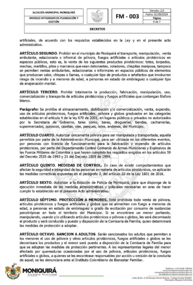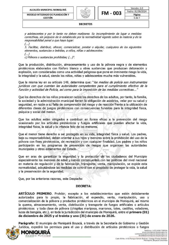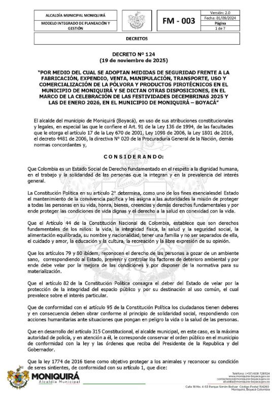 El alcalde de Moniquirá expidió el Decreto 124 del 19 de noviembre de 2025, que impone fuertes restricciones a la fabricación, venta y uso de pólvora durante diciembre y enero, con el objetivo de proteger la vida e integridad de la población, especialmente de los menores de edad.